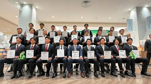 色紙を手に活躍を誓う香川オリーブガイナーズの新入団選手=2026年2月11日、高松市内、球団提供