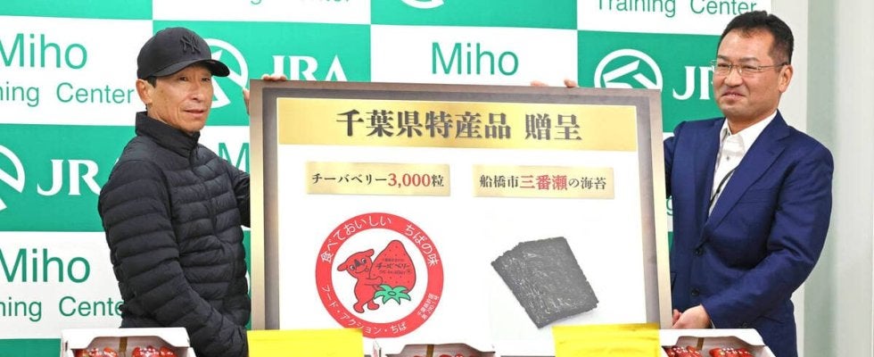 千葉県産のとちおとめ「3000個」と特産品の「のり」が贈られた横山典弘騎手(左、カメラ・荒牧 徹)