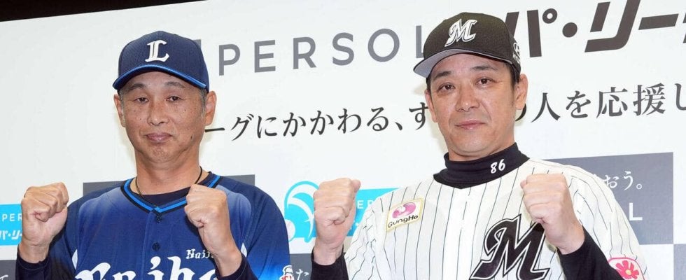 【写真】開幕前日記者会見を行った西武西口監督(左)とロッテサブロー監督(撮影・小島史椰)