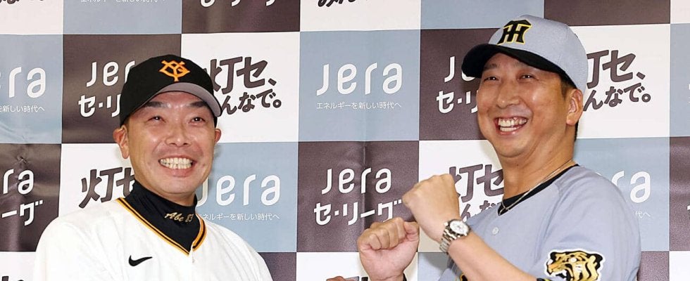 【写真】会見でガッツポーズする巨人阿部監督(左)と阪神藤川監督(撮影・浅見桂子)