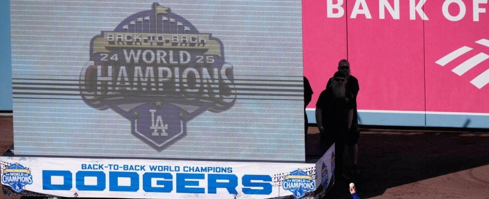 ドジャース、開幕セレモニーでフリーマン、ロハスがトロフィーをグラウンド内に置く ファン歓声