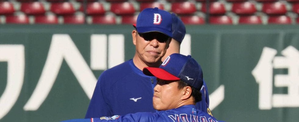 【写真】中日柳裕也。後ろは井上一樹監督(2026年3月撮影)