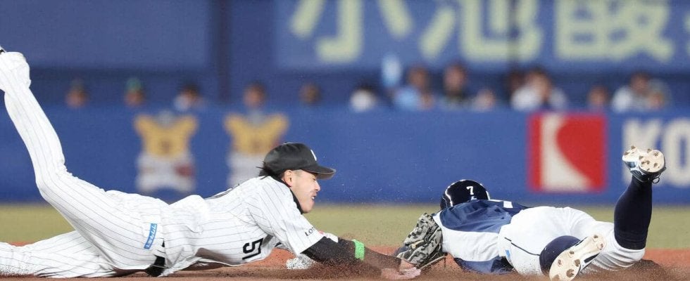 【写真】ロッテ対西武 3回表西武1死一、二塁、桑原(右)の走塁を阻止する小川(撮影・宮地輝)