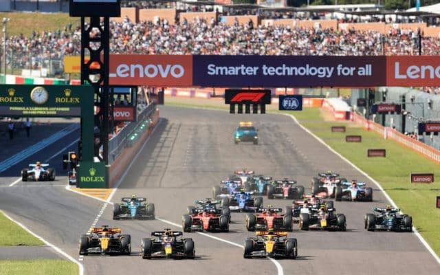 3年前のF1日本グランプリ決勝で一斉にスタートする各チームのマシン=2023年9月24日、三重・鈴鹿サーキット