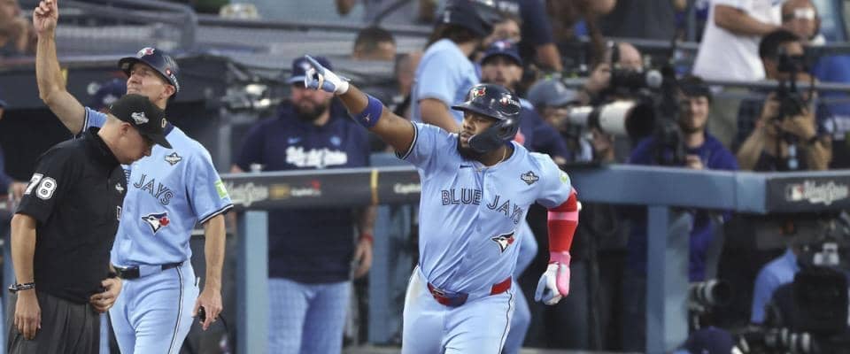 「ブルージェイズ-アスレチックス」(27日、トロント) 初回にブルージェイズのゲレーロJr.がまさかの珍シーンを引き起…
