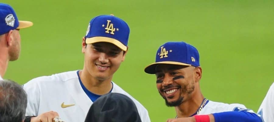 リングを着け記念撮影をするドジャースの大谷翔平(左)とムーキー・ベッツ【写真:荒川祐史】