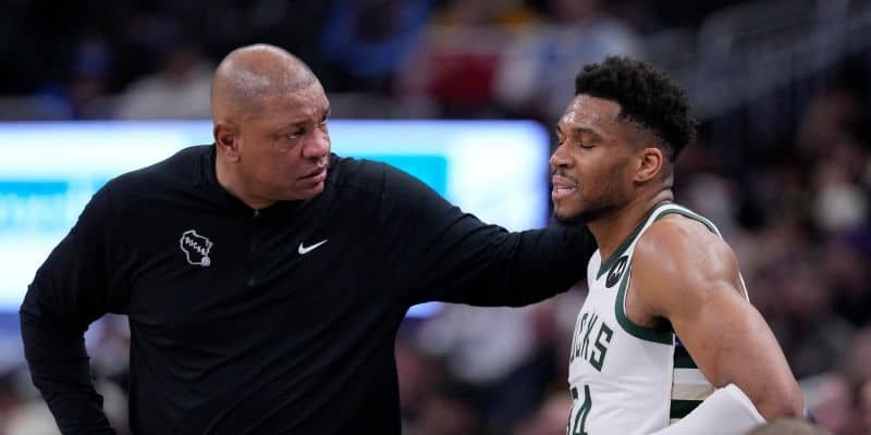 バックスのヤニス・アデトクンボ(右)とドック・リバースHC(左) = Getty Images