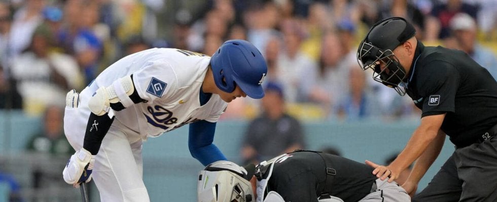 【写真】1回無死 ファウルを打ち、相手捕手を気に掛けるドジャース大谷翔平(ロイター)