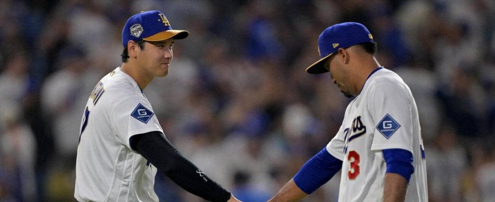 【写真】ドジャース-ダイヤモンドバックス 2試合連続セーブを挙げたディアス(右)とタッチをかわすドジャース大谷翔平