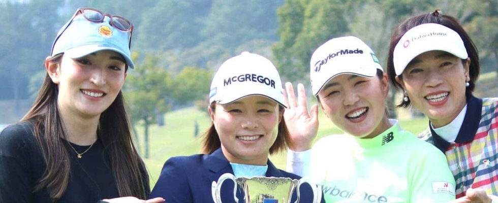 アクサレディス宮崎で4勝目を挙げ、表彰式で(左から)脇元華、1人おいて山内日菜子、大山志保に祝福される永峰咲希(左から2番目)
