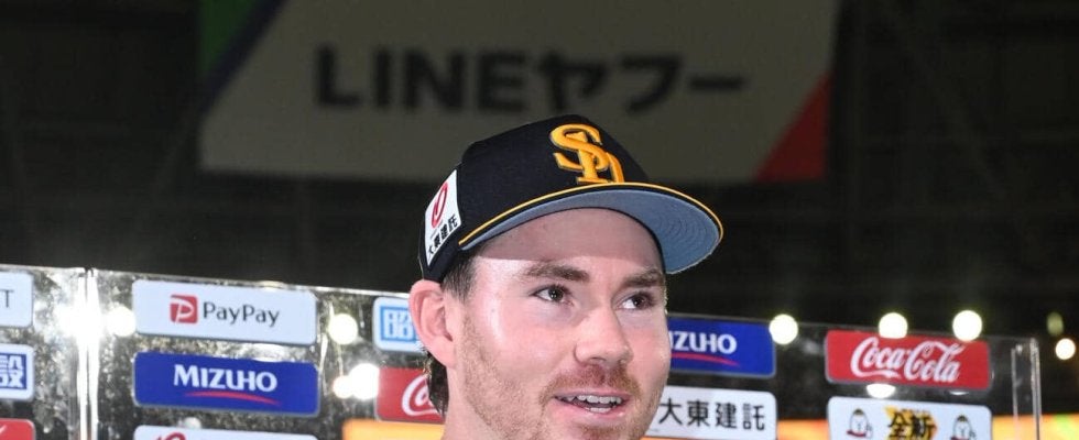 【写真】ソフトバンク対日本ハム 笑顔でヒーローインタビューに応じるスチュワート(撮影・林敢治)