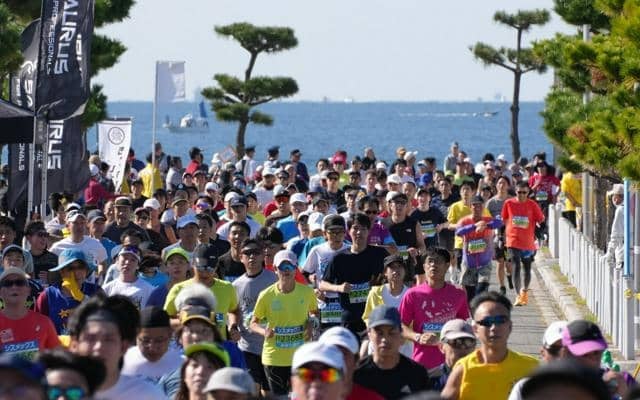 昨年の神戸マラソン。瀬戸内海を背景に走るランナーたち=2025年11月16日、兵庫県明石市