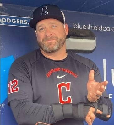 「ドジャース-ガーディアンズ」(30日、ロサンゼルス) ガーディアンズのボート監督が試合前のベンチでドジャースの先発、…
