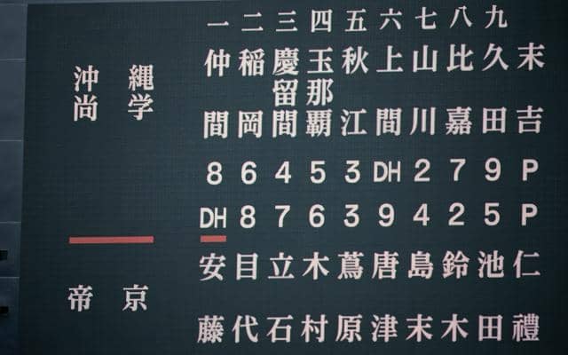 選抜高校野球大会は今春から指名打者制が導入され、スコアボードに「DH」が表示された=2026年3月19日、阪神甲子園球場