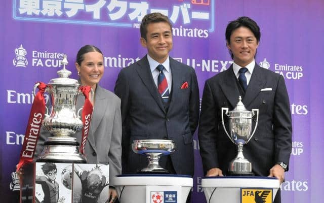 日本とイングランドにゆかりのある三つのカップと、記念撮影に応じる稲本潤一さん(中央)、李忠成さん(右)