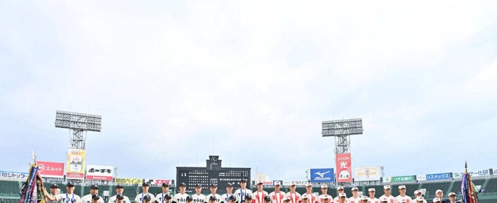 【写真】大阪桐蔭対智弁学園 決勝を終え記念撮影する大阪桐蔭(左)と智弁学園の選手たち(撮影・滝沢徹郎)