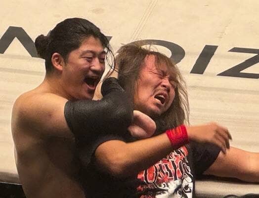 内藤哲也(右)を絞め上げるOZAWA