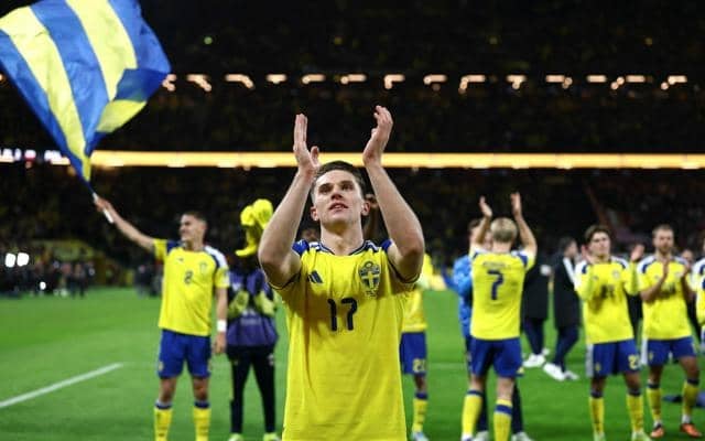 欧州プレーオフ決勝を制し、喜ぶスウェーデンのヨケレス(中央)=ロイター