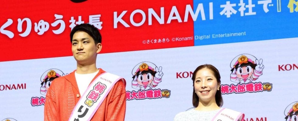 【写真】「桃太郎電鉄2~あなたの町もきっとある~」(C)さくまあきら(C)konami Digital Entertainmentのイベント会見に登場の木原(左)と三浦(撮影・黒川智章)