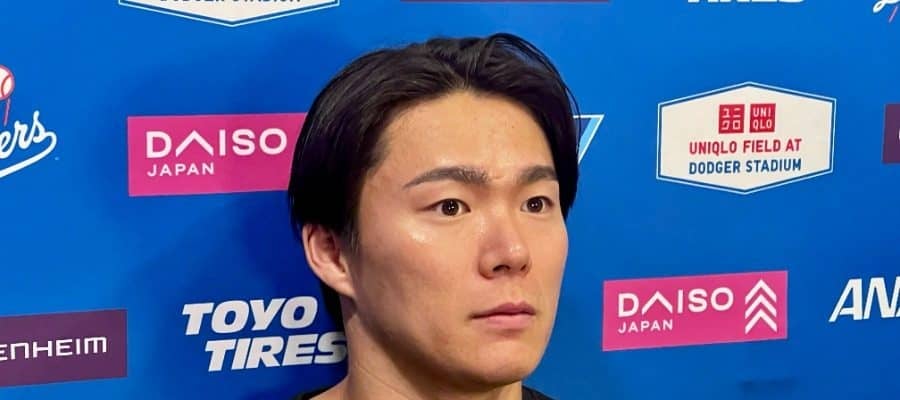 試合後、取材に応じたドジャース・山本由伸【写真:小谷真弥】