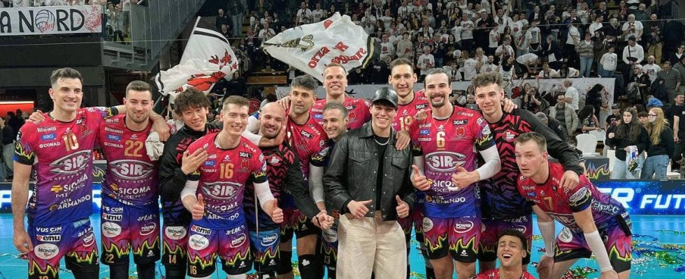 勝利後の記念撮影で笑顔を見せる石川祐希(左から3人目)らペルージャの選手たち