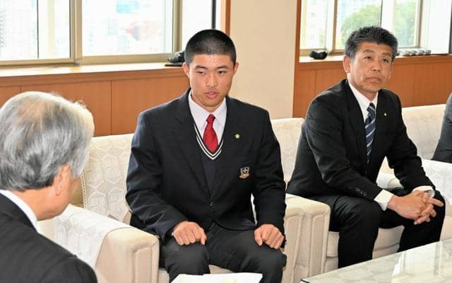 福田富一知事(左)に大会の報告をする佐野日大の中村盛汰主将(中央)=2026年4月2日、栃木県庁、津布楽洋一撮影