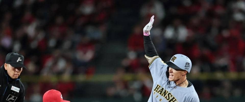 「広島2-4阪神」(3日、マツダスタジアム) 初スタメンの阪神・福島圭音外野手が二塁打でプロ初安打記録。二塁進塁は際ど…