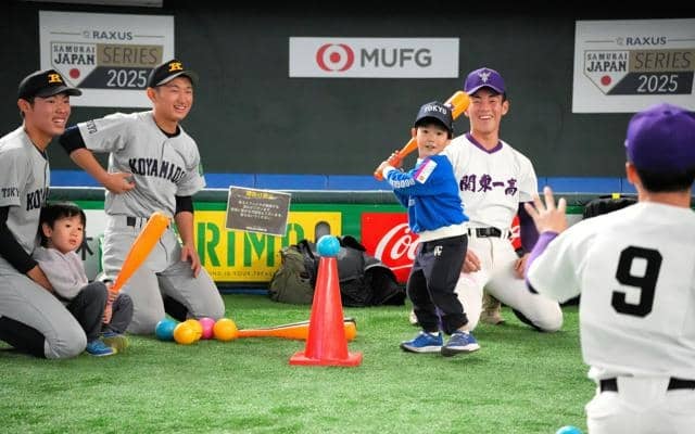 昨年11月、日本高校野球連盟と日本野球機構(NPB)が開いたイベントで、やわらかいボールとバットで遊ぶ未就学児と高校球児=東京ドーム