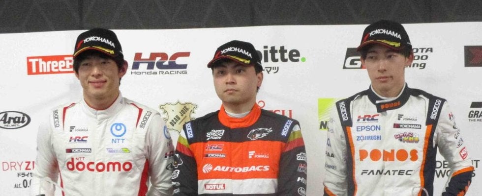 スーパーフォーミュラの開幕戦でポールを獲得した岩佐(中央、左は2位の太田、右は3位の佐藤)