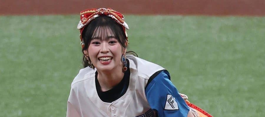 【実際の様子】ふりふりスカートの美女が豪快投球 大役終えて“照れ笑い”…人気アイドルにファン虜