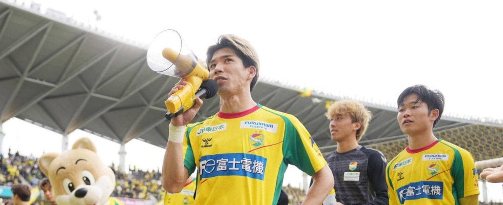 【写真】千葉対東京V 決勝ゴールを決めた千葉日高は拡声器でサポーターに勝利を報告する(撮影・小沢裕)
