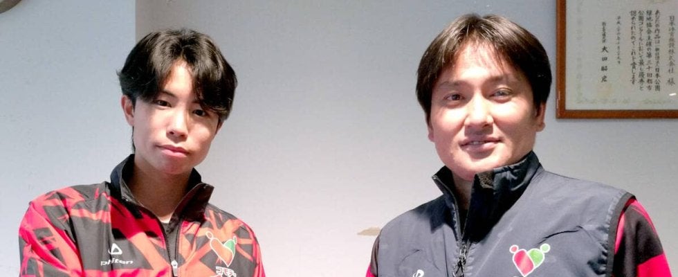 コモディイイダのジャージーを着て社会人1年目の抱負を明かした宇田川瞬矢(左、右は会沢陽之介監督)