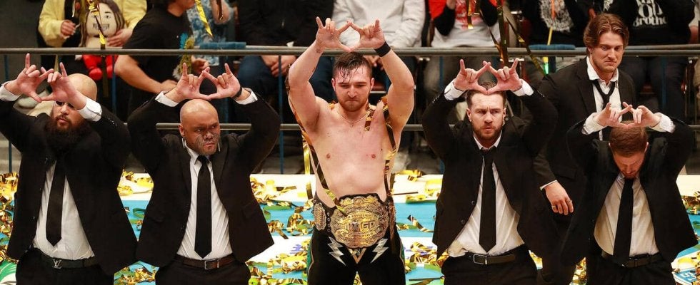 【写真】IWGP世界ヘビー級新王者に輝いたカラム・ニューマン(中央)(撮影・中島郁夫)