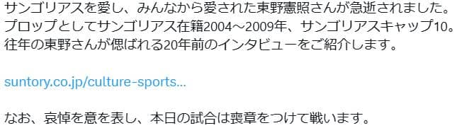 ラグビーのU19日本代表経験がある元トップリーガーで、フランカーやプロップとして活躍した東野憲照さんが3日朝、死亡した。…