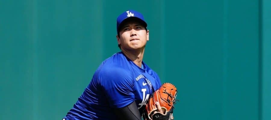 試合前、キャッチボールをするドジャース・大谷翔平【写真:黒澤崇】