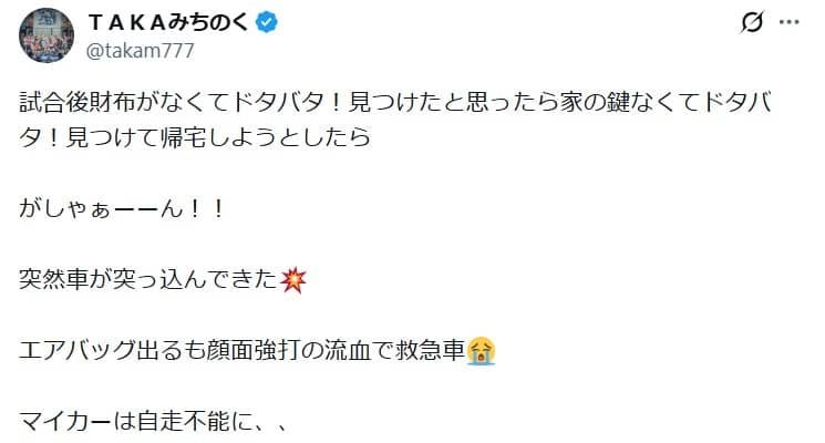 人気プロレスラーTAKAみちのく(52)が5日、Xを更新。前夜、交通事故に遭い、自家用車が大破した写真を投稿した。「試合…