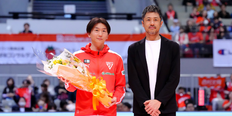 今季限り現役引退の千葉J・西村文男を祝福…広島・朝山HCからの花束贈呈に「光栄に思います」 | バスケットボール