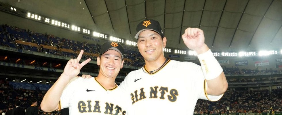 【写真】巨人対DeNA DeNAに勝利し笑顔を見せる巨人井上(左)と大城(撮影・たえ見朱実)