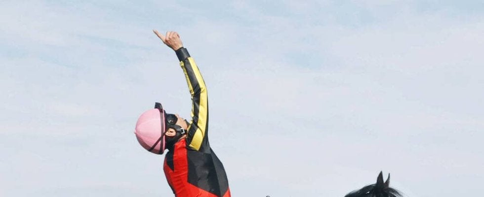 北村友はクロワデュノールの背で天に向かって指を突き上げる