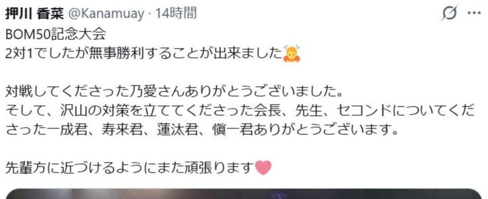 【写真】カナ・ウォーワンチャイは自身のXで藤原乃愛戦の勝利を報告した