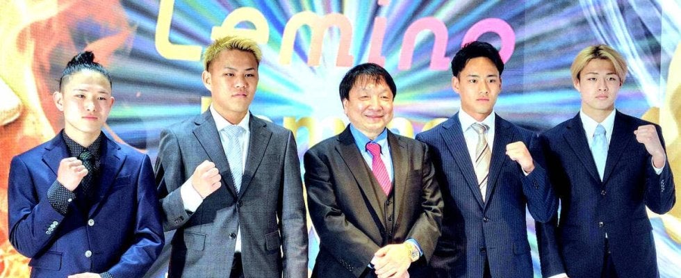 6月10日にプロデビュー戦に臨む藤木勇我(左から2人目)ら大橋ジム勢(左から片岡雷斗、藤木、大橋秀行会長、坂井優太、片岡叶夢)(カメラ・勝田 成紀)