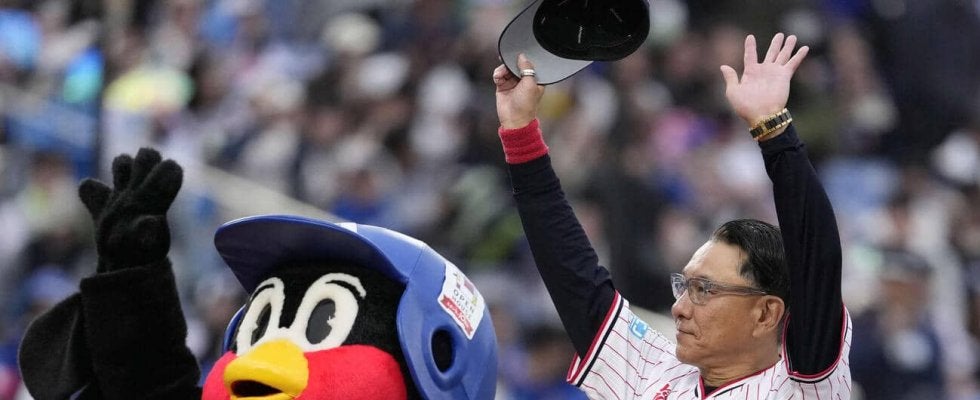 【写真】スタンドにあいさつするつば九郎(左)と池山隆寛監督(2026年4月撮影)