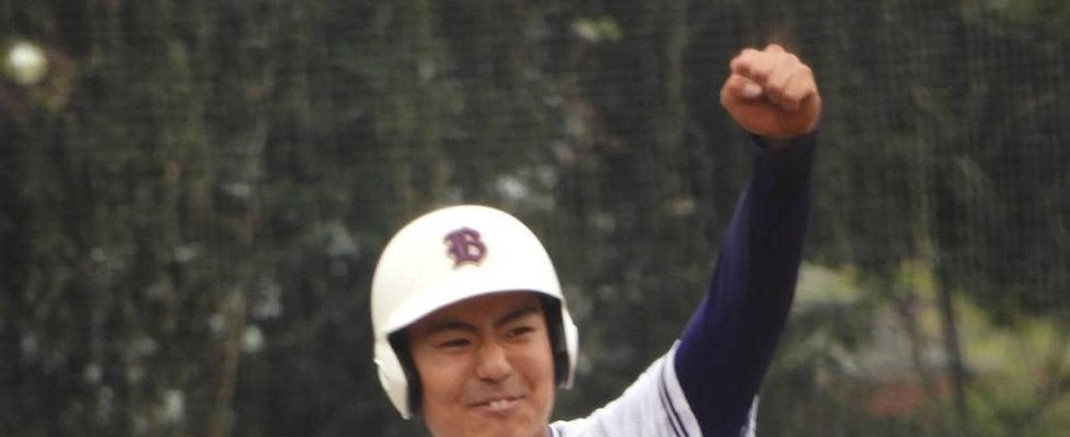 8回に貴重な3点目となる三塁打を放ってベースで喜ぶ文京・池田
