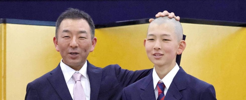 騎手課程第45期生入学式 父の勝嵜太資調教助手(左)に祝福される勝嵜文哉さん(カメラ・荒牧 徹)