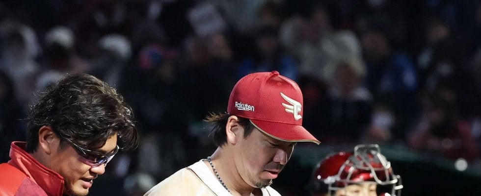 <楽天-日本ハム>◇7日◇楽天モバイル最強パーク楽天前田健太投手(37)が右足ふくらはぎ付近を気にするそぶりを見せ、緊急…