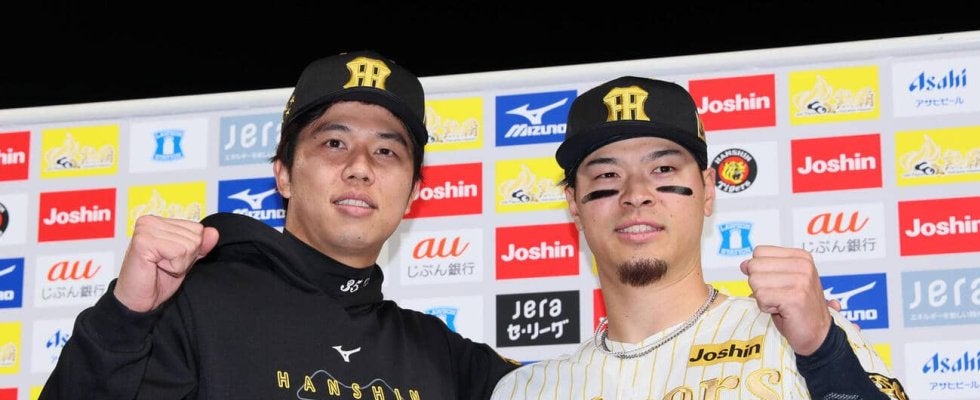 【写真】阪神対ヤクルト ヒーローインタビューを終えポーズを決める阪神才木(左)と佐藤(撮影・加藤哉)