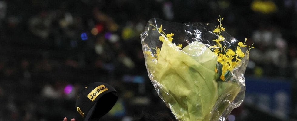 【写真】阪神対ヤクルト 阪神才木はリーグ記録に並ぶ1試合奪三振「16」を記録し花束を手に笑顔を見せる(撮影・加藤哉)