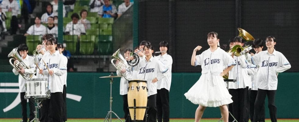 【写真】2025年6月3日、西武対ヤクルトの試合前、演奏パフォーマンスする花咲徳栄の吹奏楽部
