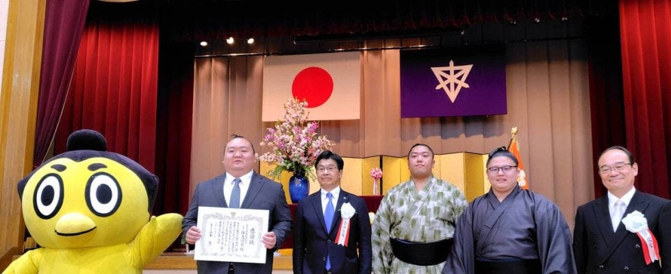 墨田区から感謝状を受け取った桐山親方(左から2番目)