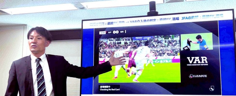 Jリーグでの事象をフィードバックし、説明を行うJFAの佐藤マネジャー(2026年4月8日)(カメラ・岡島智哉)